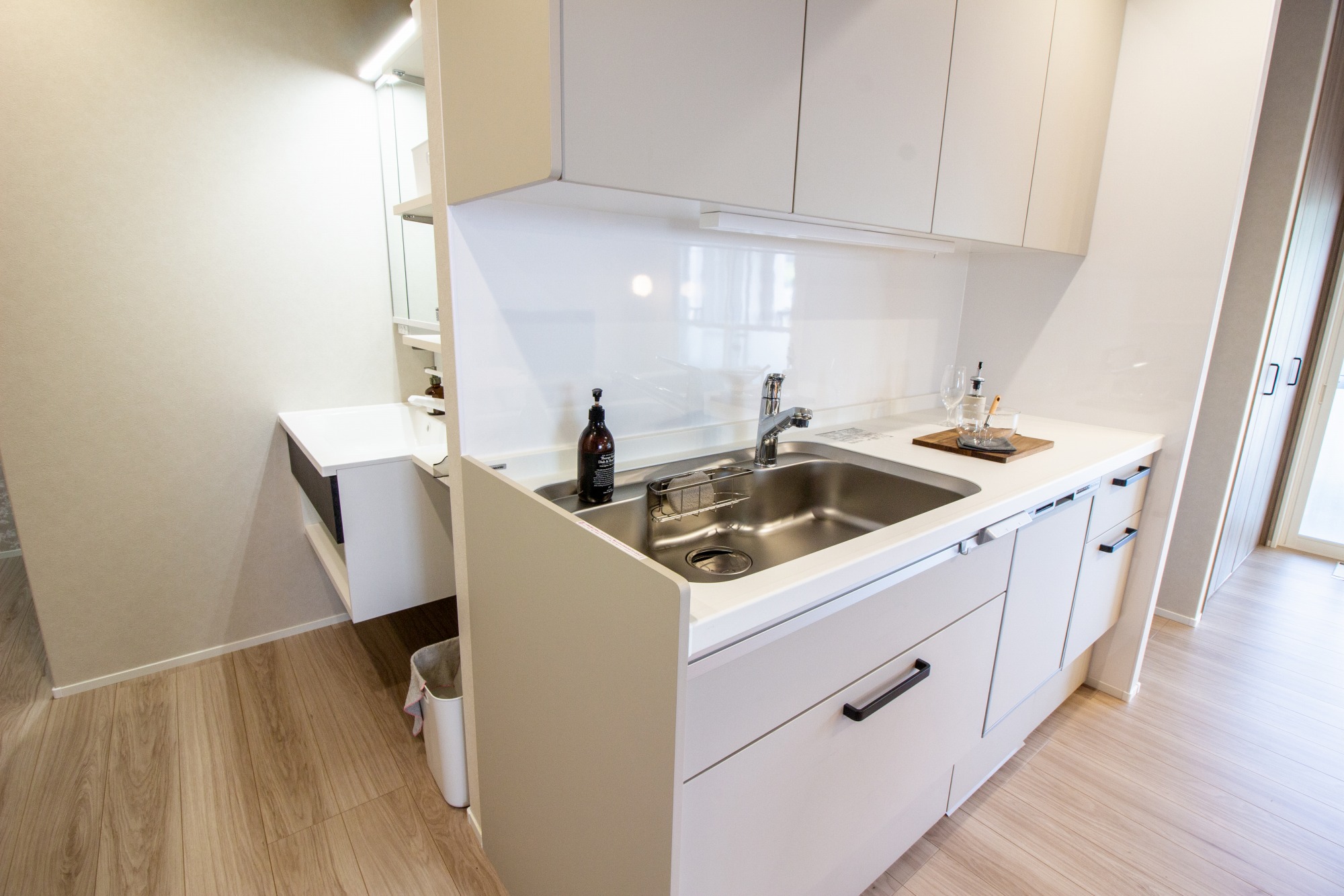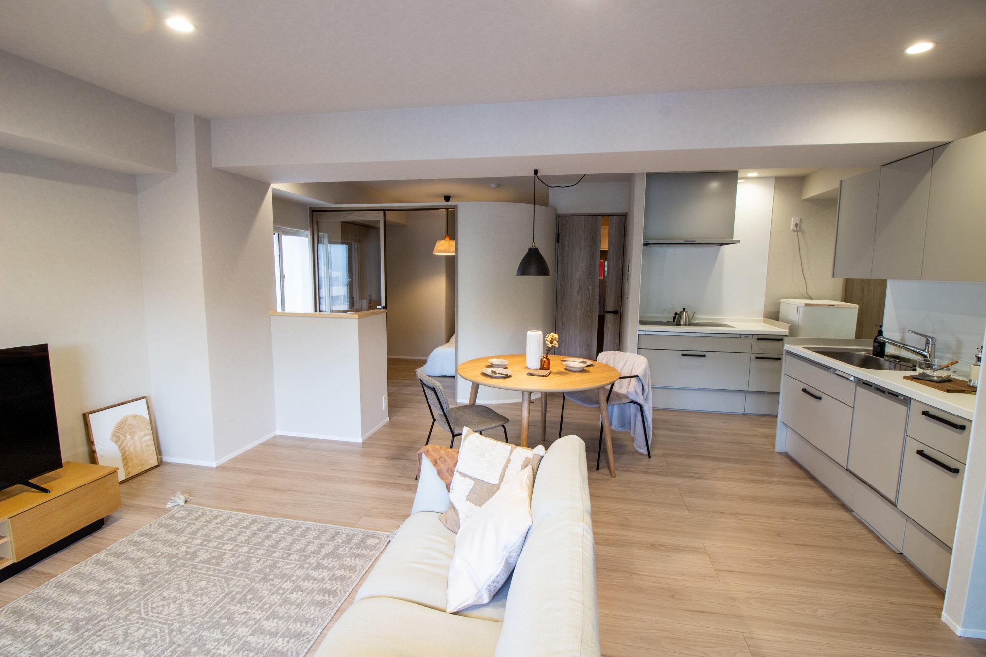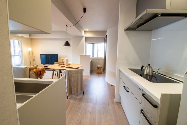 細切れだった間取りを繋げることで、キッチンからリビング全体を見渡せるレイアウトに変更。 床材を明るいトーンで統一することで、実際の平米数以上に広く感じられる空間に仕上げました。右奥のスペースにはカウンターも設け、ワークスペースや飾り棚として活用できるゆとりも生まれています。