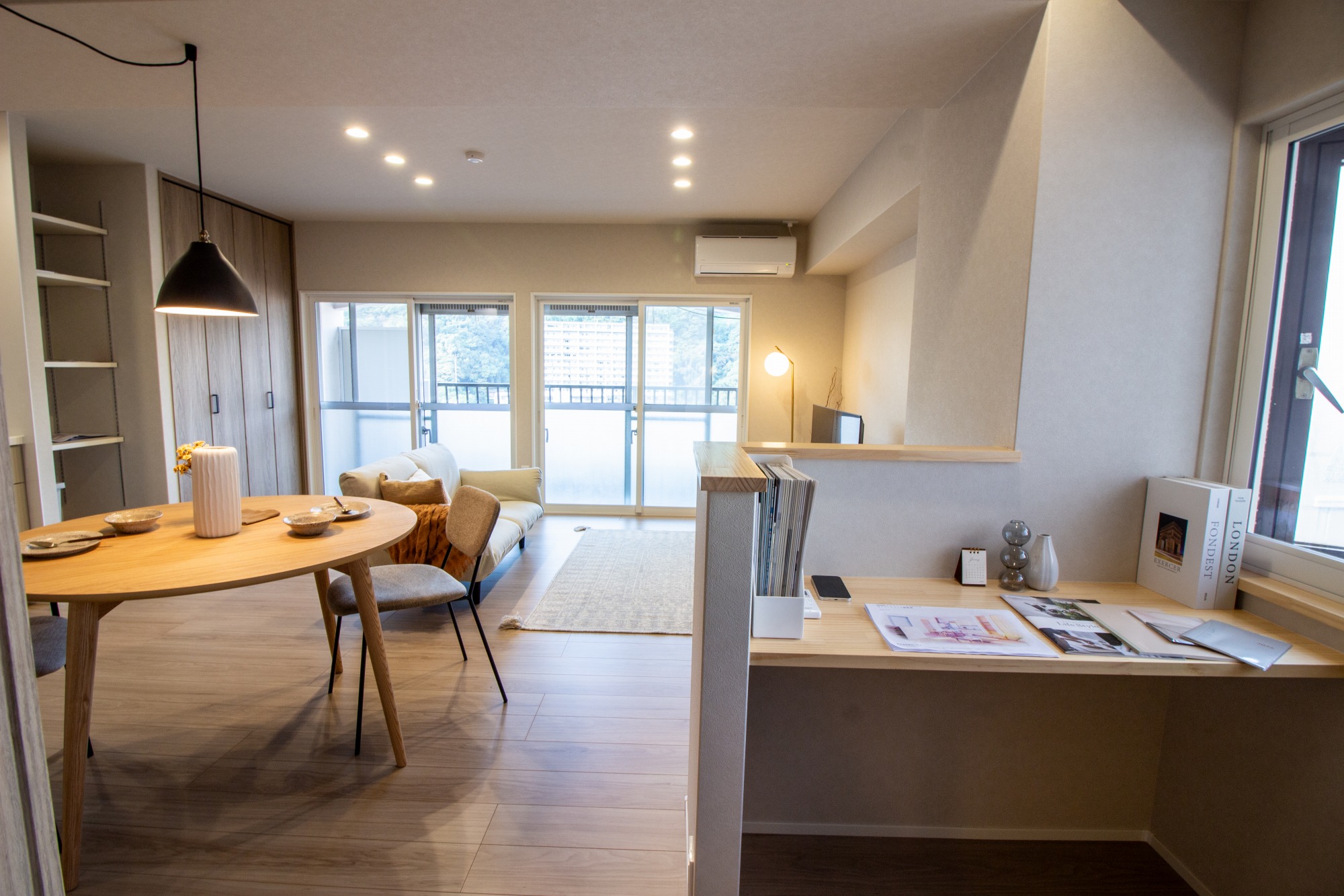 - 「ただ綺麗にするだけでなく、暮らしが楽しくなる空間」を目指しました。 一番のこだわりは、主寝室とリビングを緩やかに仕切る「R壁(曲線の壁)」です。直線的な空間に柔らかさをプラスし、圧迫感を軽減するアクセントになっています。 また、以前は活用されていなかった出窓スペースにカウンターを造作し、リモートワークや読書ができる特等席をつくりました。古さを活かしつつ、現代のライフスタイルに合わせた「遊び心のあるリノベーション」をご提案できたと思います。